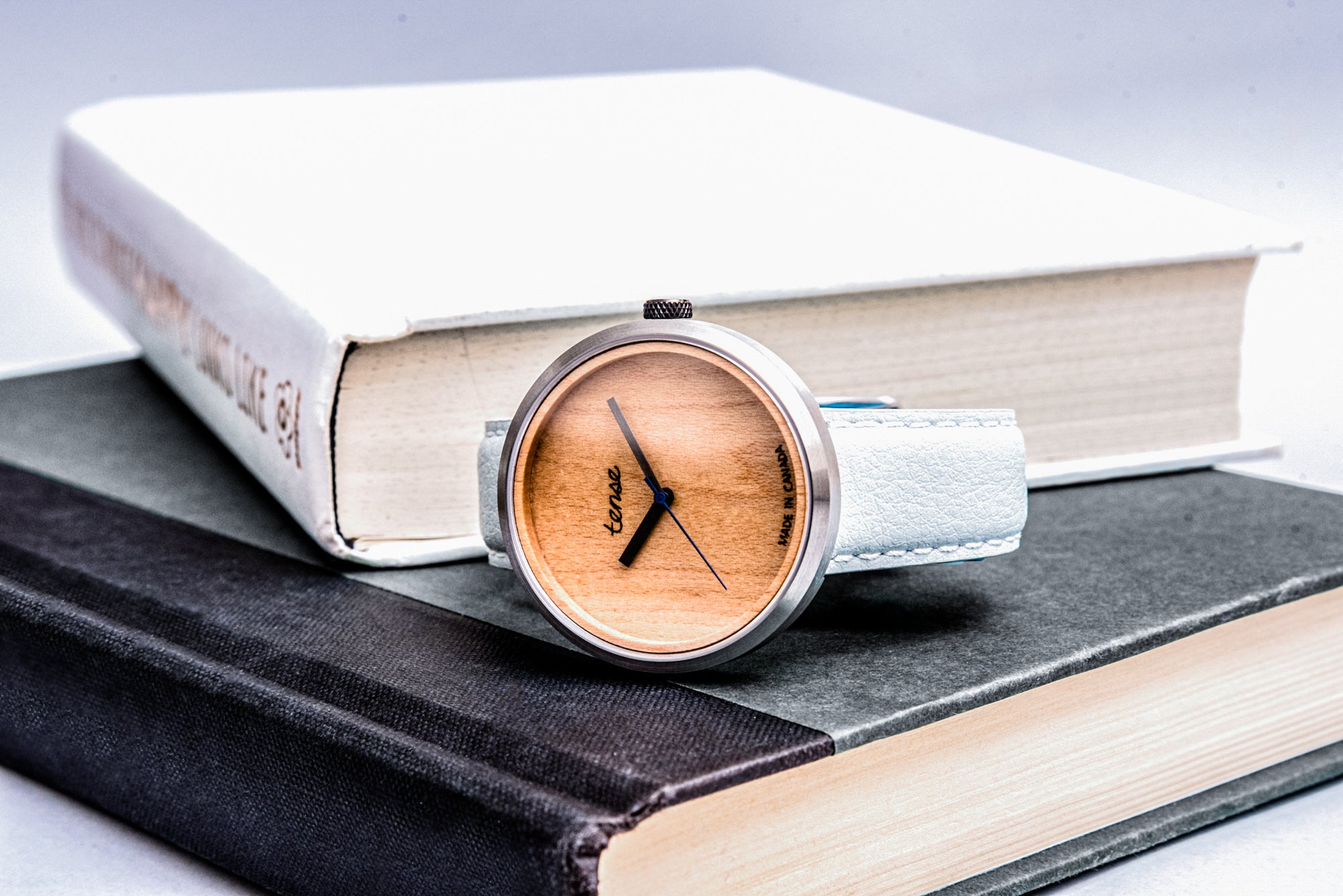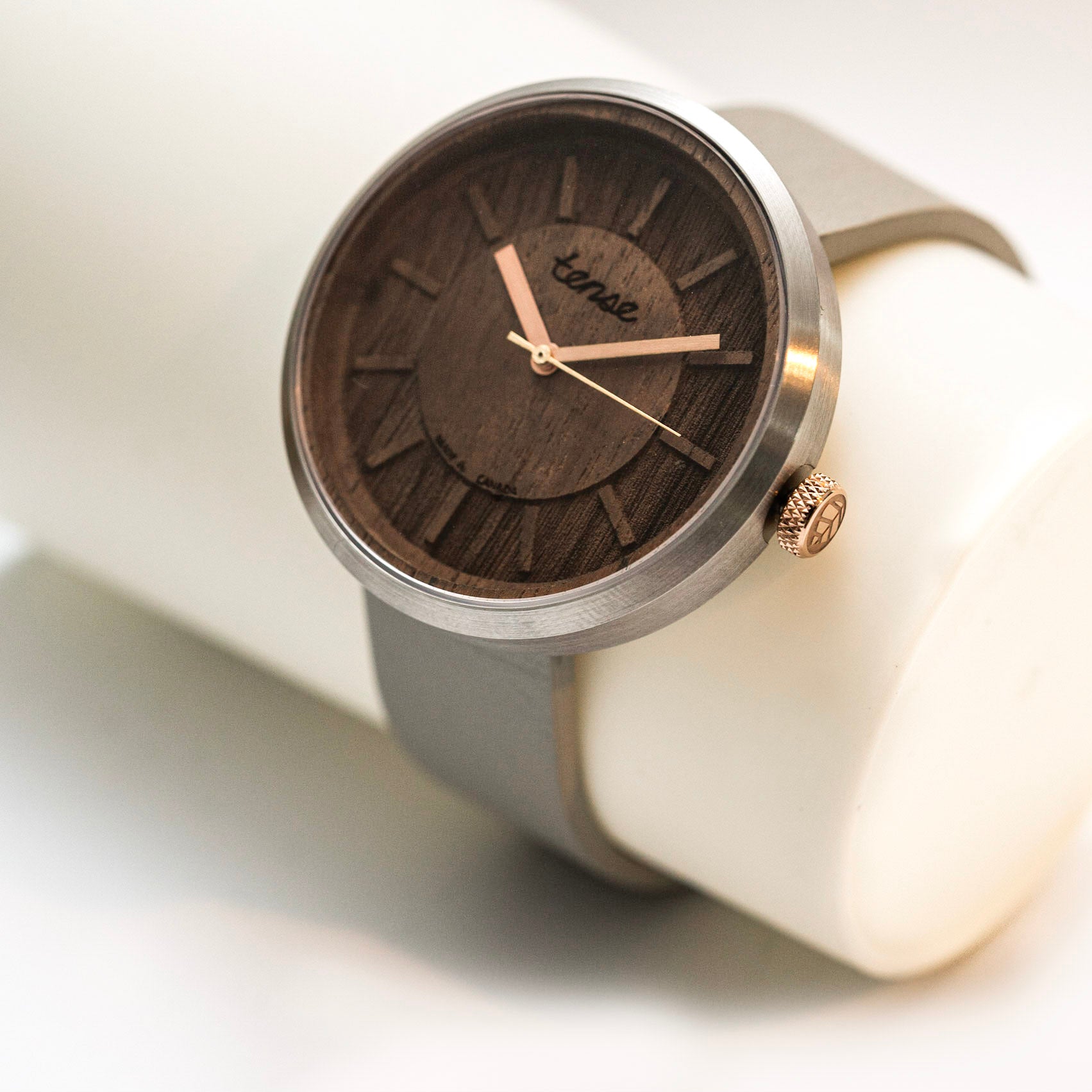 The Cypress Watch has a wood dial and metal case on a leather strap, combining multiple natural materials as part of the new Tense Hybrid Watch Series. This watch is unisex. It contains Swiss-made Ronda 763 Movements protected by scratch-resistant Sapphire Crystal and corrosion resistant Surgical Grade 316 Stainless Steel finished with PVD coating. It has a waterproof rating of 5 ATM. The strap is made of vegan-friendly leather.