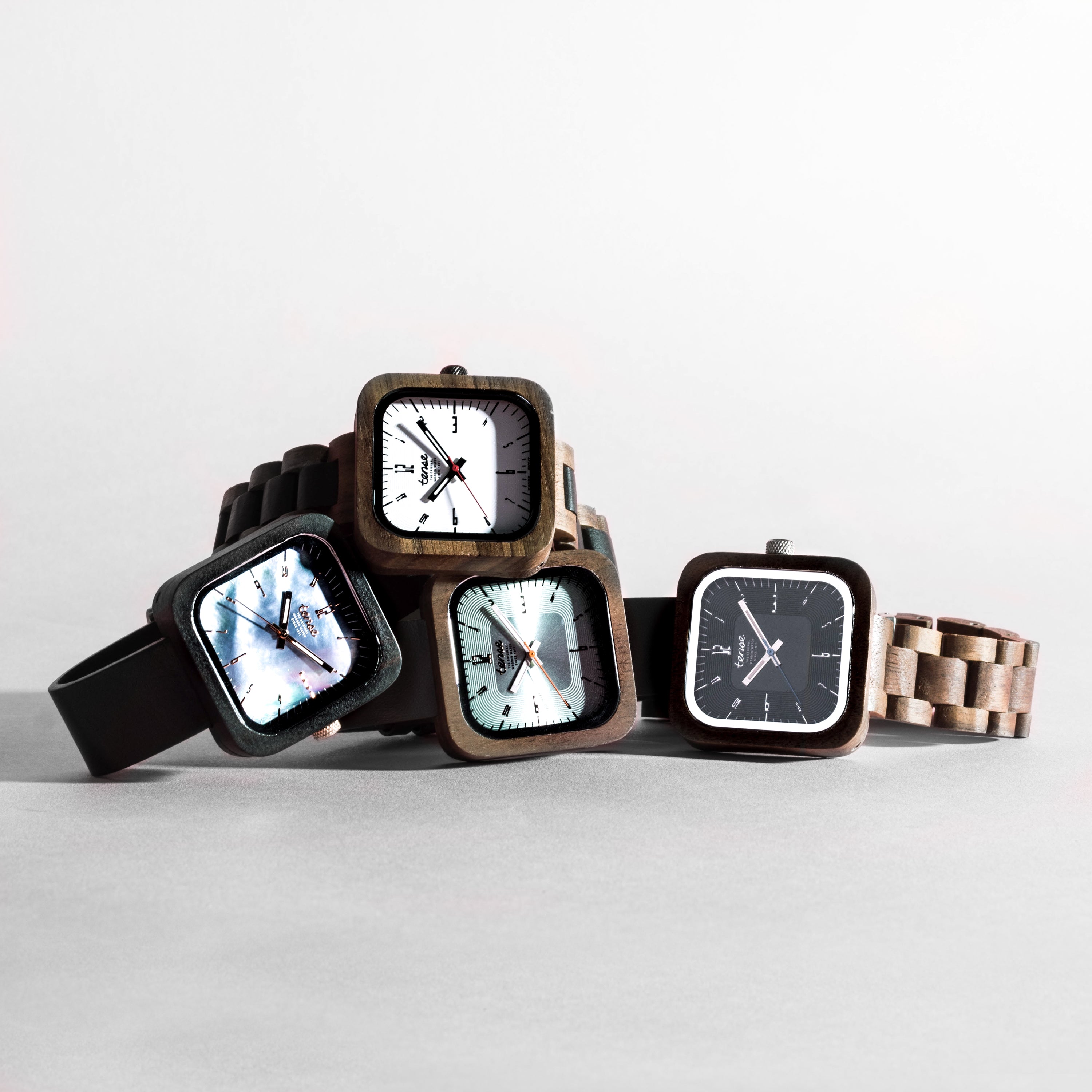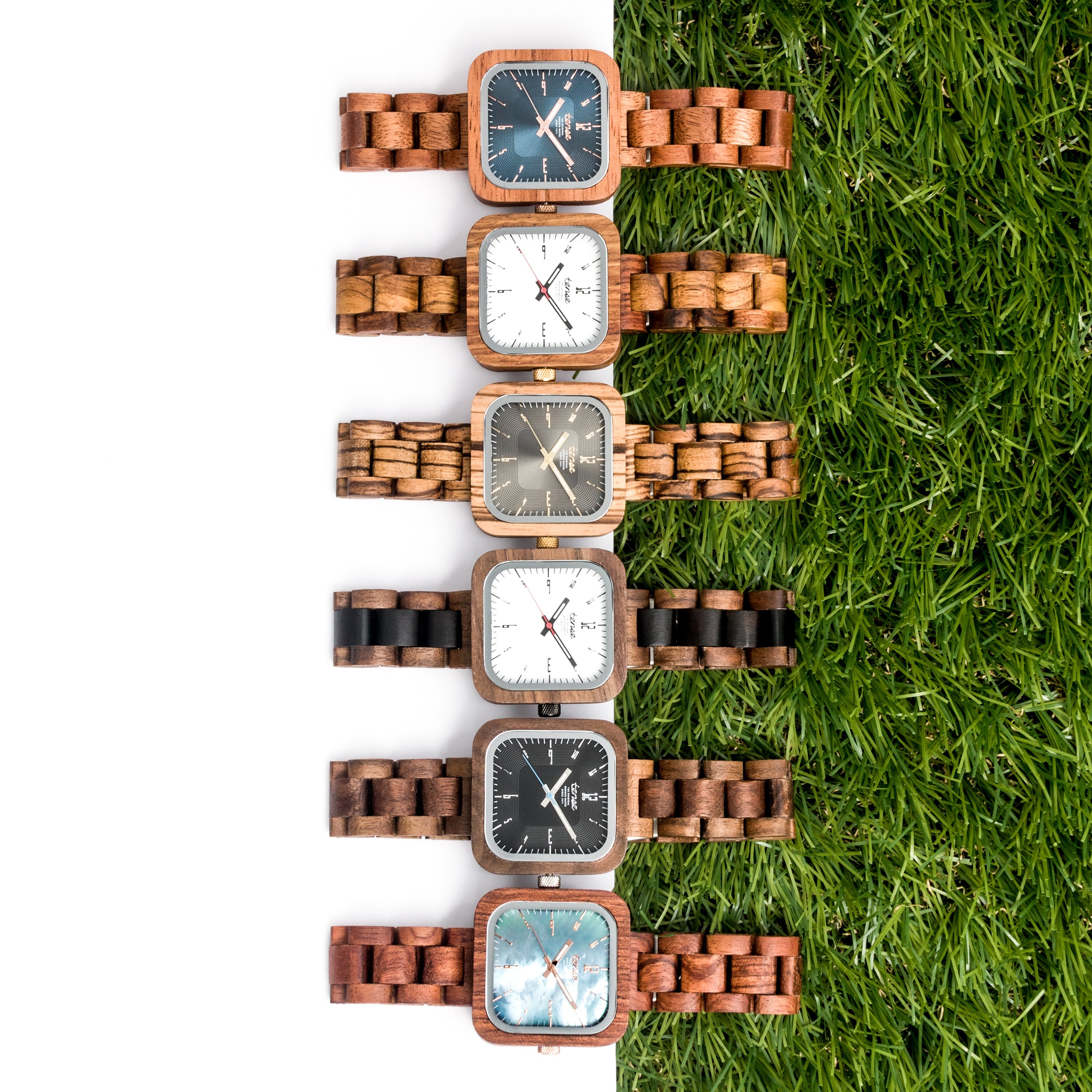 This unisex watch shows hour, minute, and second markers on a square dial. The Labrador is made from 100% recycled or reclaimed wood, with Swiss Watch Movement and is adjustable in size.