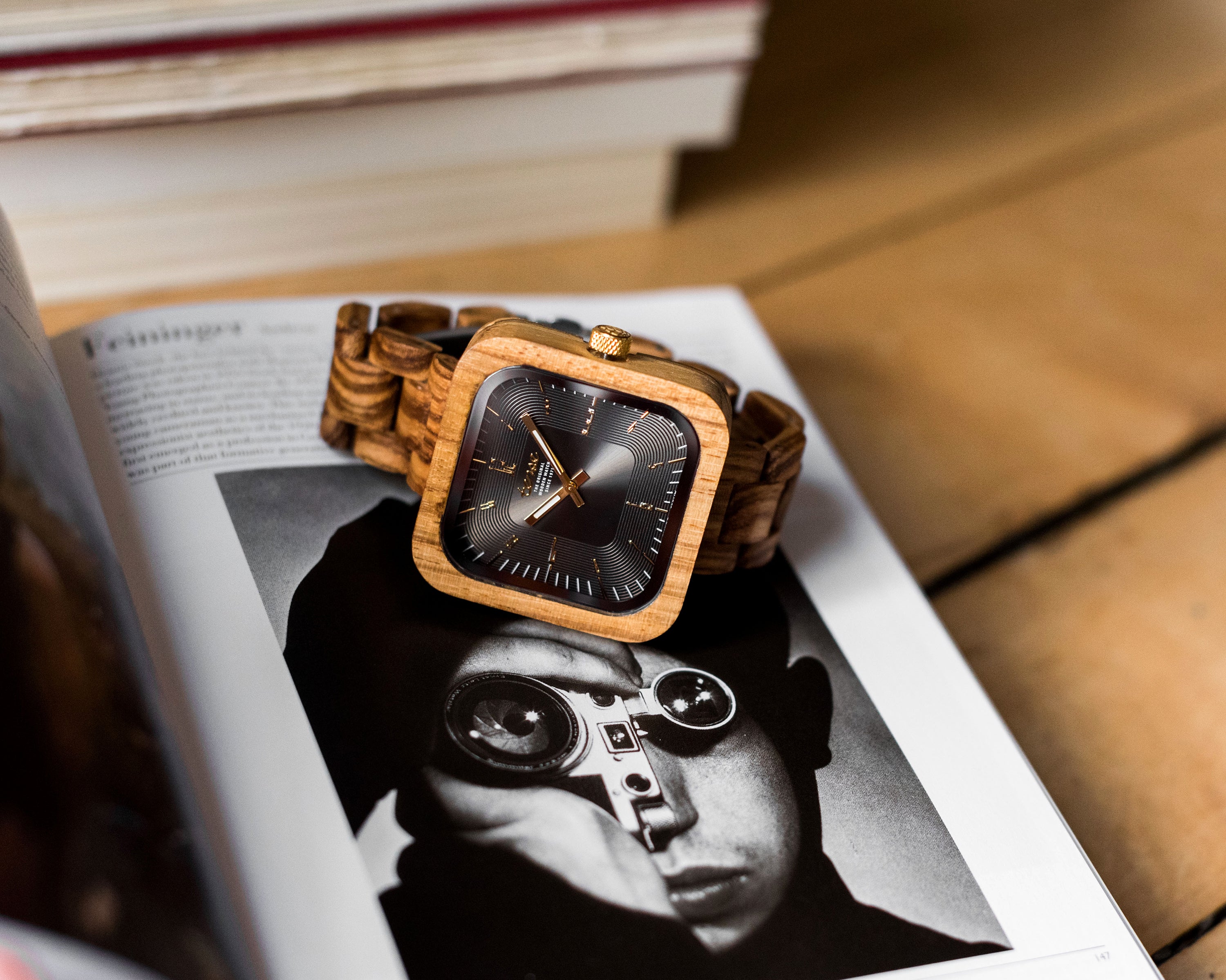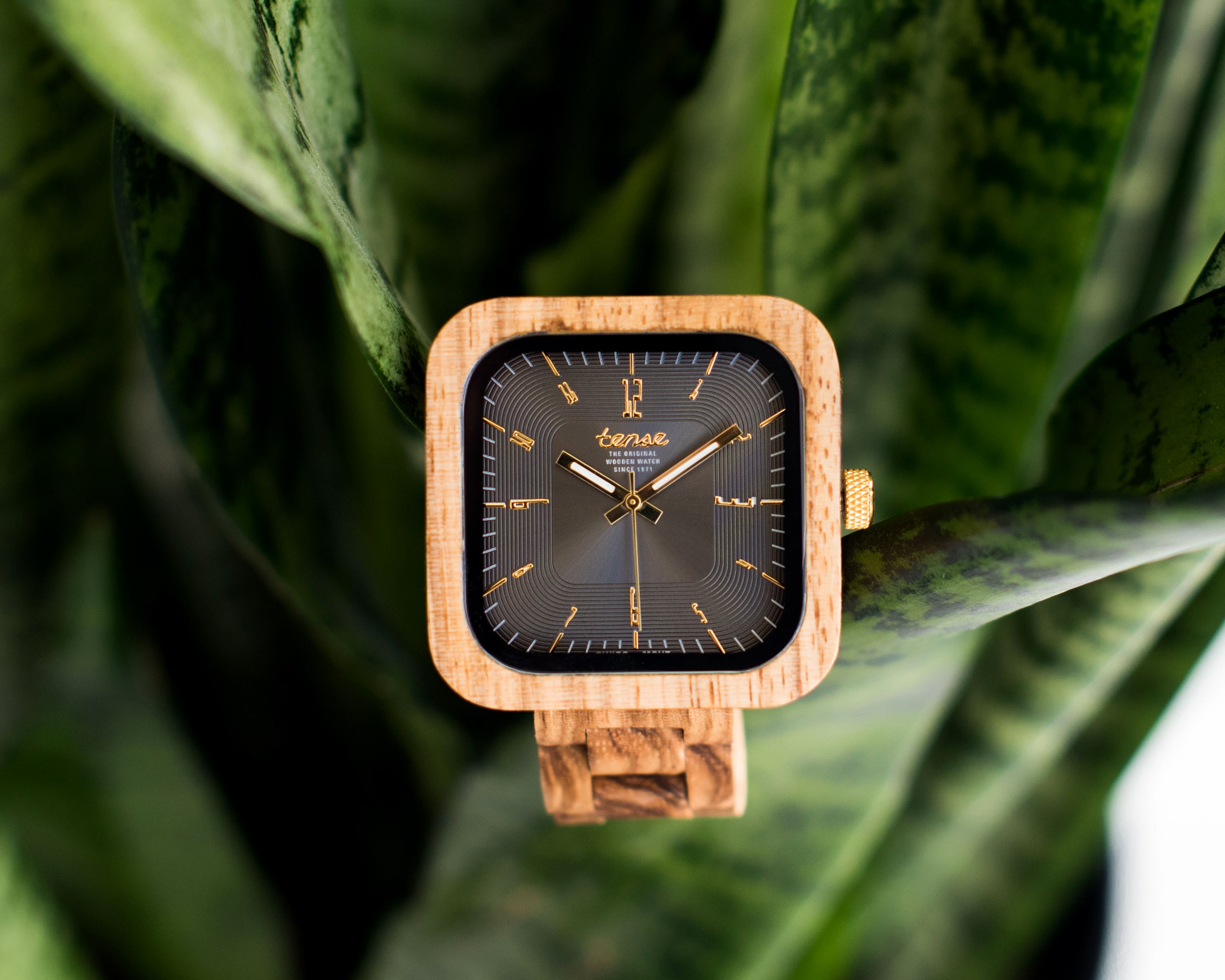 This unisex watch shows hour, minute, and second markers on a square dial. The Labrador Vegan Leather is made from 100% recycled or reclaimed wood, with Swiss Watch Movement. The strap is made of vegan-friendly leather and features a stainless steel clasp.
