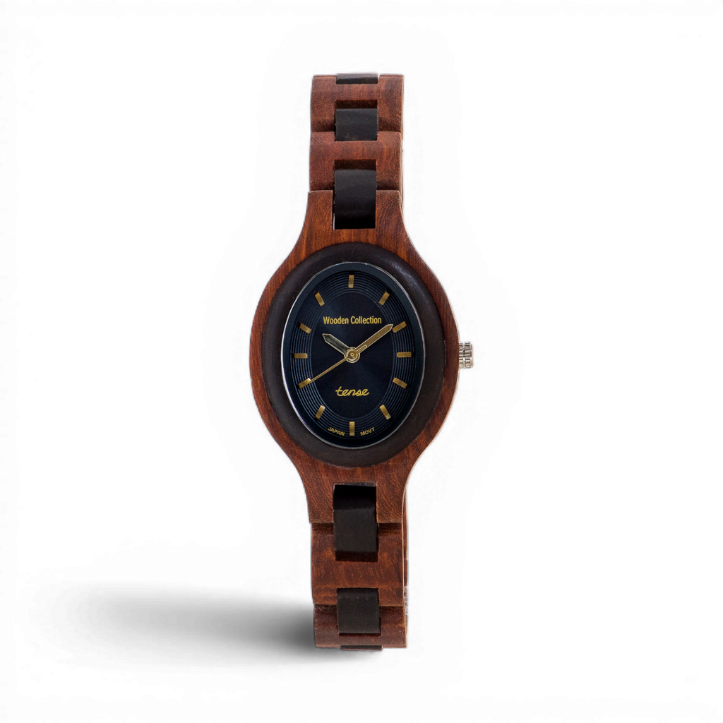 This women's watch shows hour, minute and second markers on an oval face. The Victoria is made from 100% recycled and reclaimed wood, with Miyota watch movement from Japan and is adjustable in size with stainless steel crown and clasp.