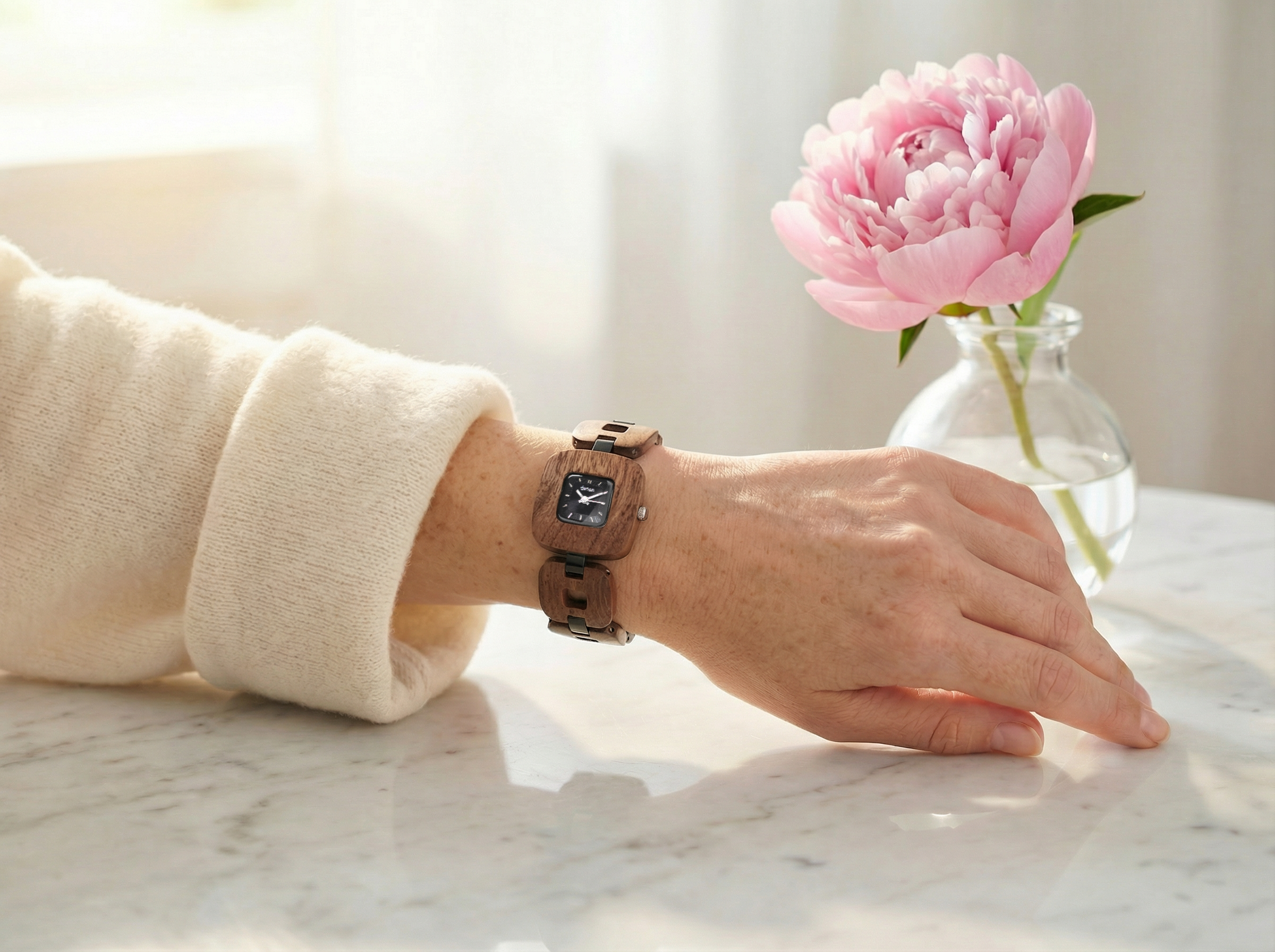 NEW ARRIVAL This women’s watch features hour markers on a square dial with a vintage-inspired design. The Nova showcases a compact wooden case and alternating wood and metal link construction for a bold, sculpted look. It is made from 100% recycled or reclaimed wood, combined with metal for added strength and style. Powered by a Japanese Miyota movement and adjustable for a comfortable fit.