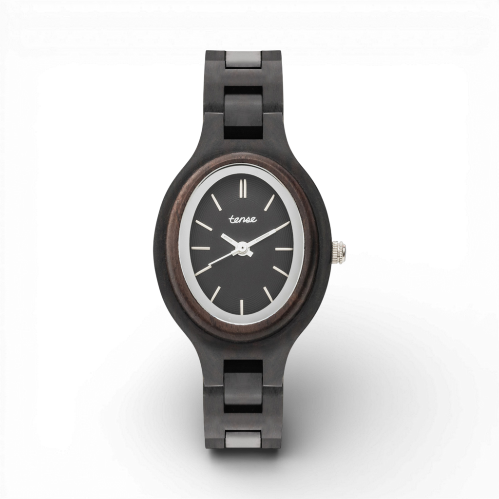 This women's watch shows hourly markers on a oval dial. The Mayne is apart of our Mini Collection. This watch is made from 100% recycled and reclaimed wood, with Miyota watch movement from Japan and is adjustable in size with stainless steel crown and clasp. All Tense Watches are Proudly Made In Canada.