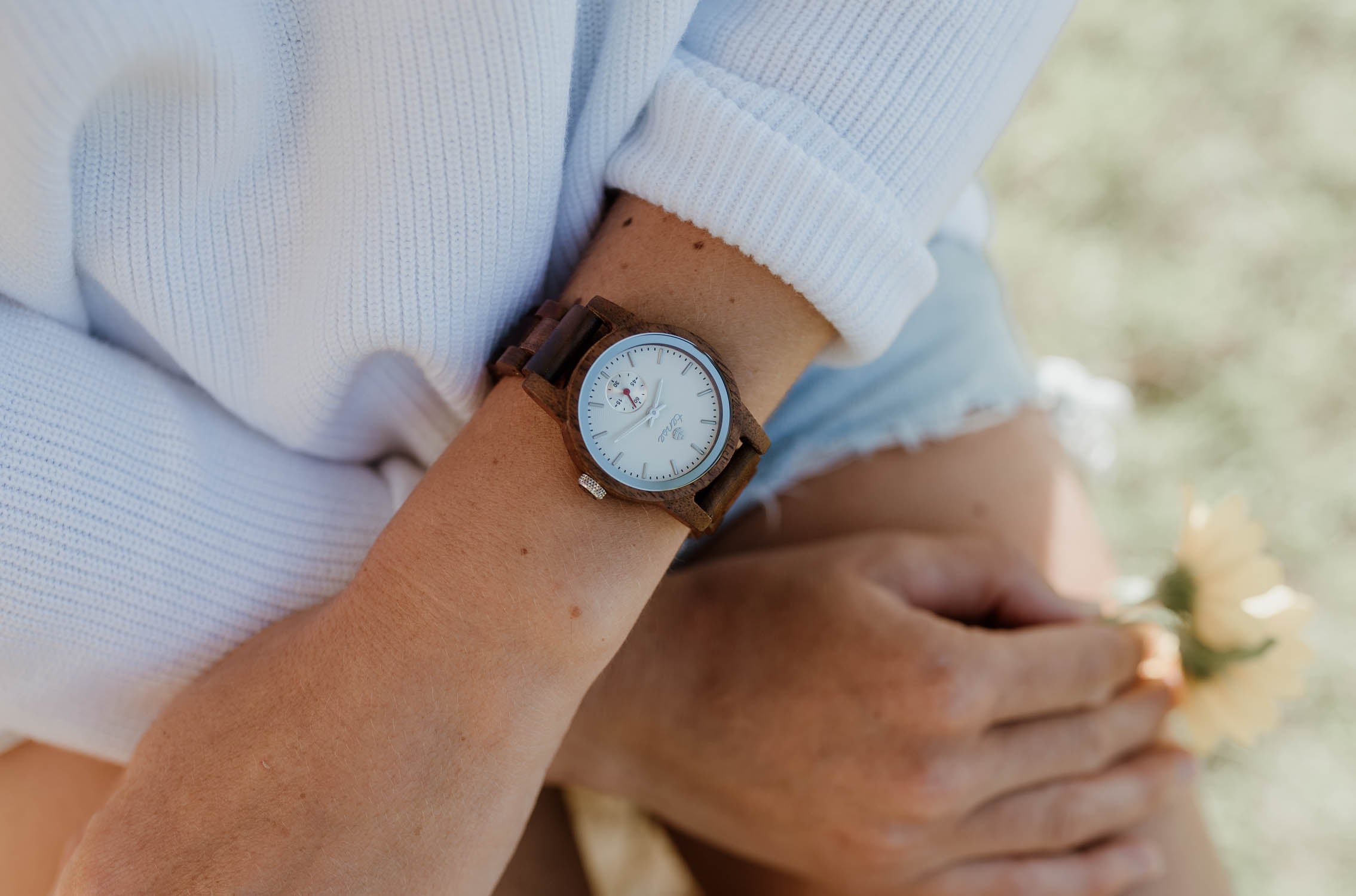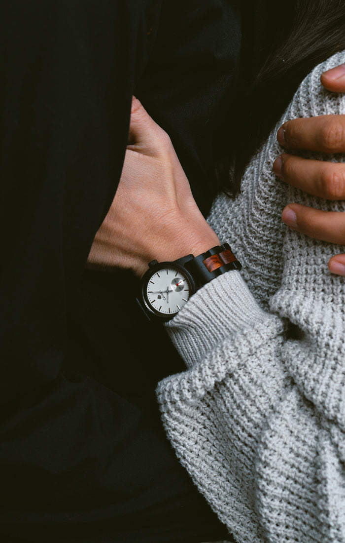 This women's watch shows hourly markers on a round dial. The Small Hampton is made from 100% recycled or reclaimed wood with Miyota watch movement from Japan and is adjustable in size.