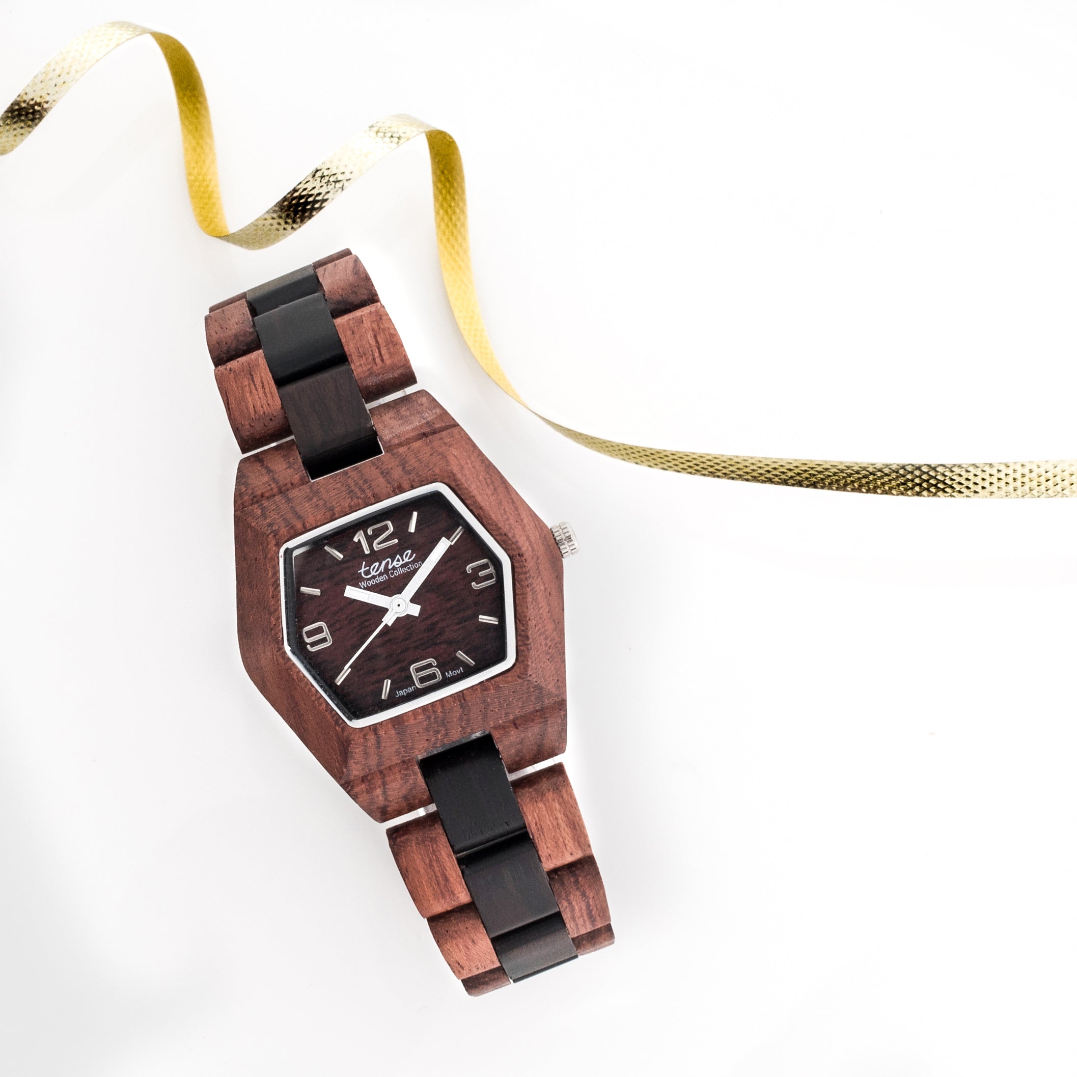 This women's watch shows hour, minute and second markers on a hexagon face. The Small Kootenay is made from 100% recycled and reclaimed wood, with Miyota watch movement from Japan and is adjustable in size with stainless steel crown and clasp.