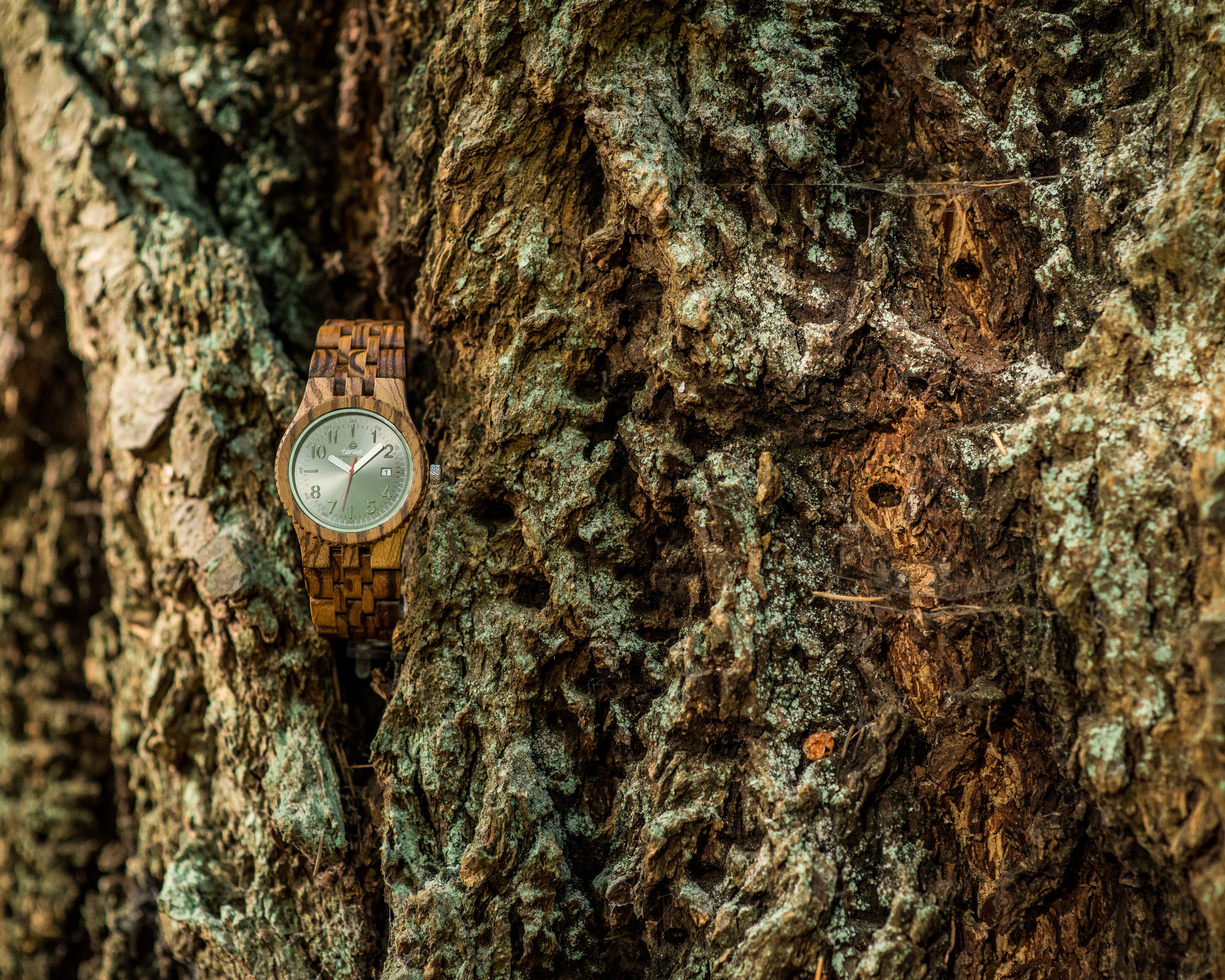 This men's watch shows hour, minute, second markers and the calendar date on an oversized round face. The Yukon is made from 100% recycled and reclaimed wood, with Miyota watch movement from Japan and is adjustable in size with stainless steel crown and clasp.