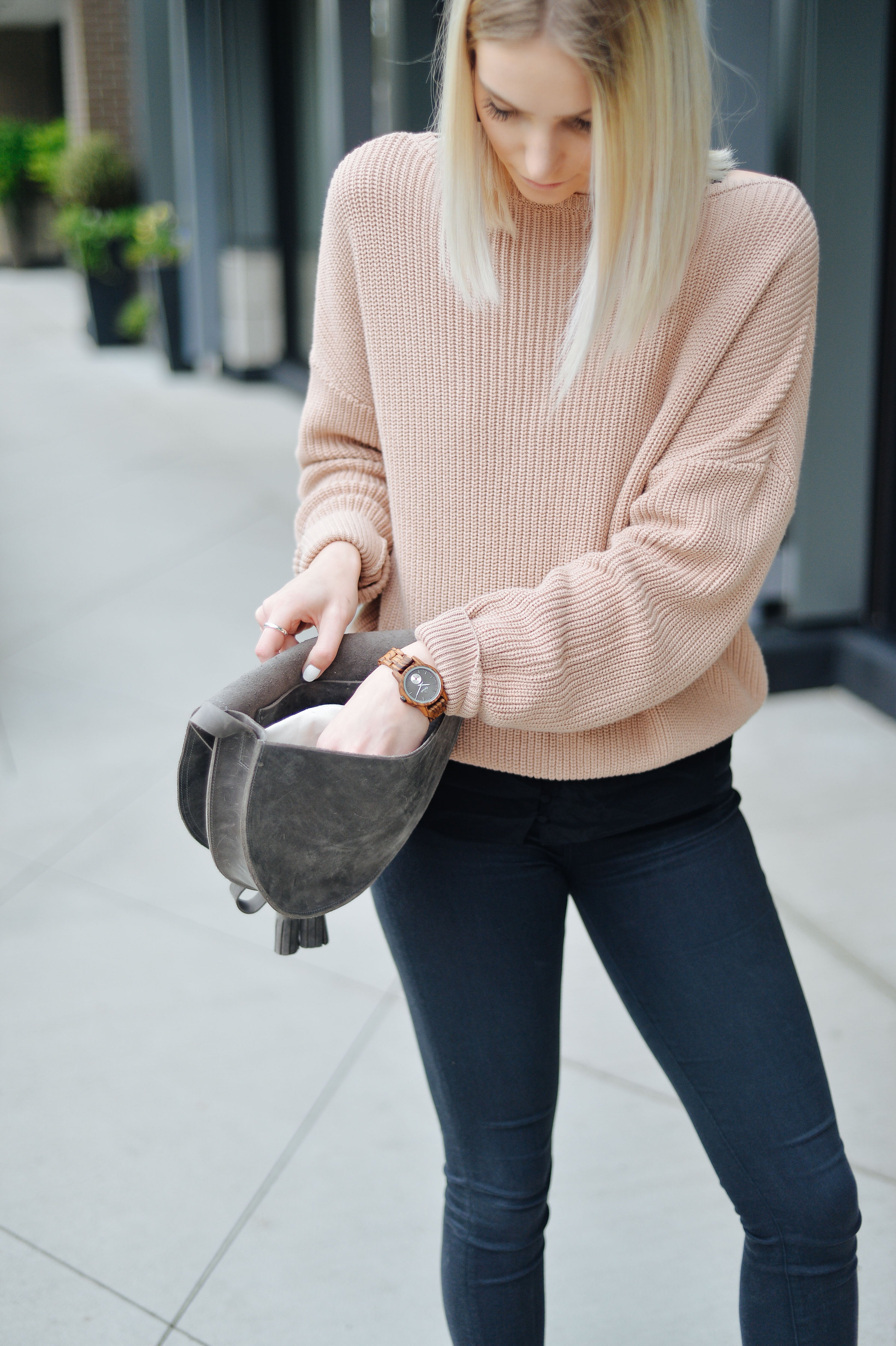This women's watch shows hour, minute, and second markers on a round dial. The Small Leather Hampton is made from 100% recycled or reclaimed wood, with Miyota watch movement from Japan. The strap is made of genuine Italian Leather.