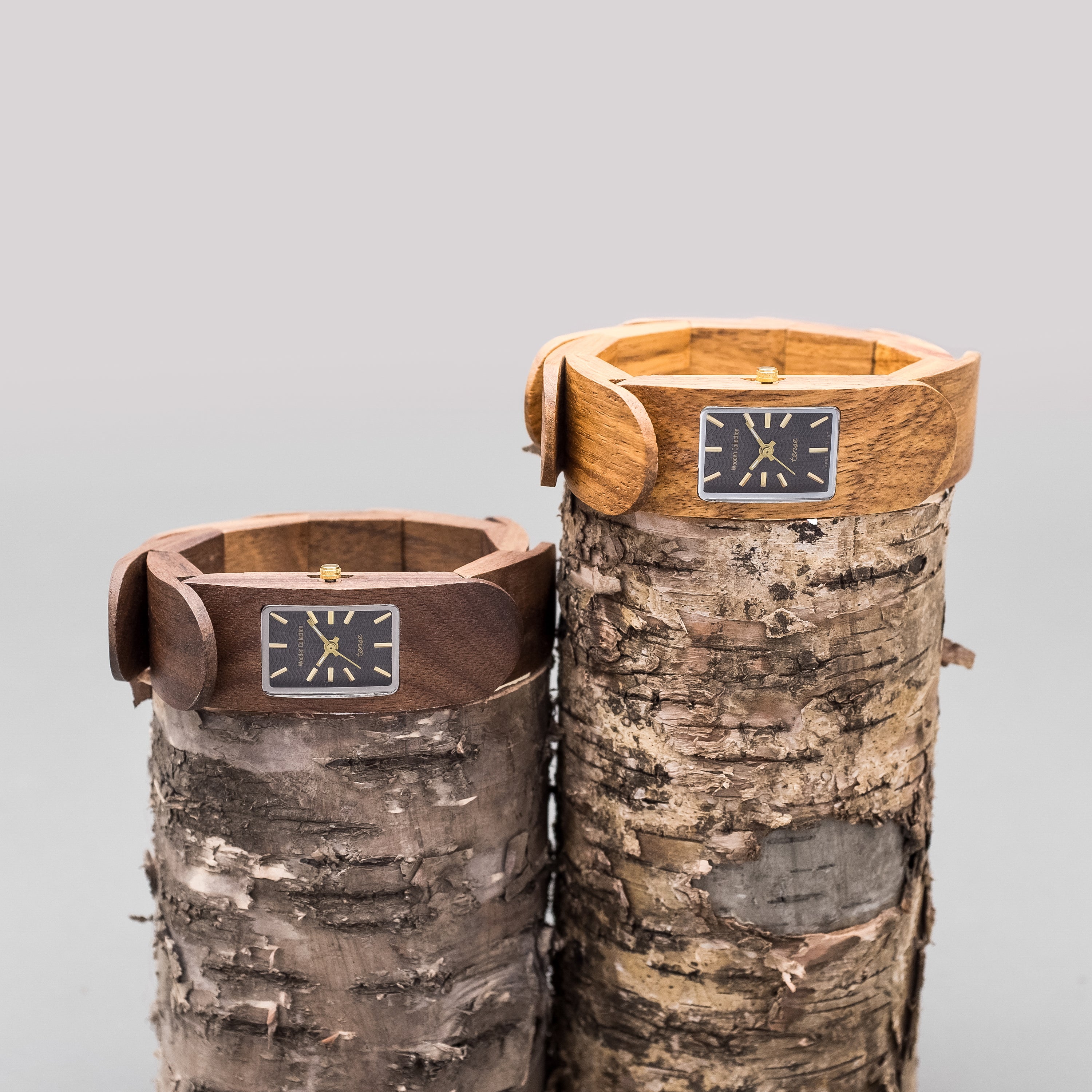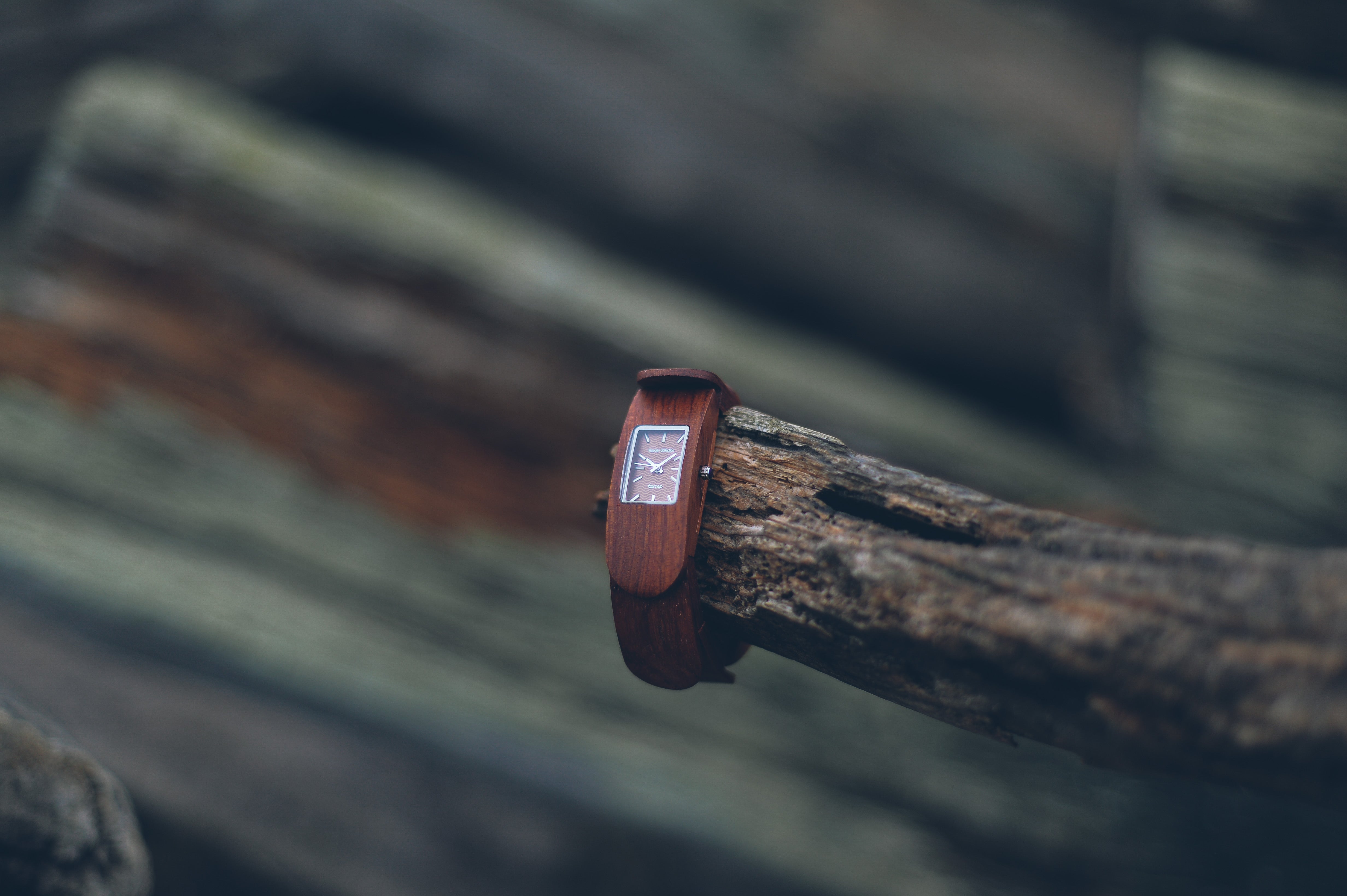 This unisex watch shows hourly markers on a rectangular face. It features an elastic band with irregularly shaped wood pieces forming into a spiral bracelet. The Elaho is made from 100% recycled and reclaimed wood, with Miyota watch movement from Japan.