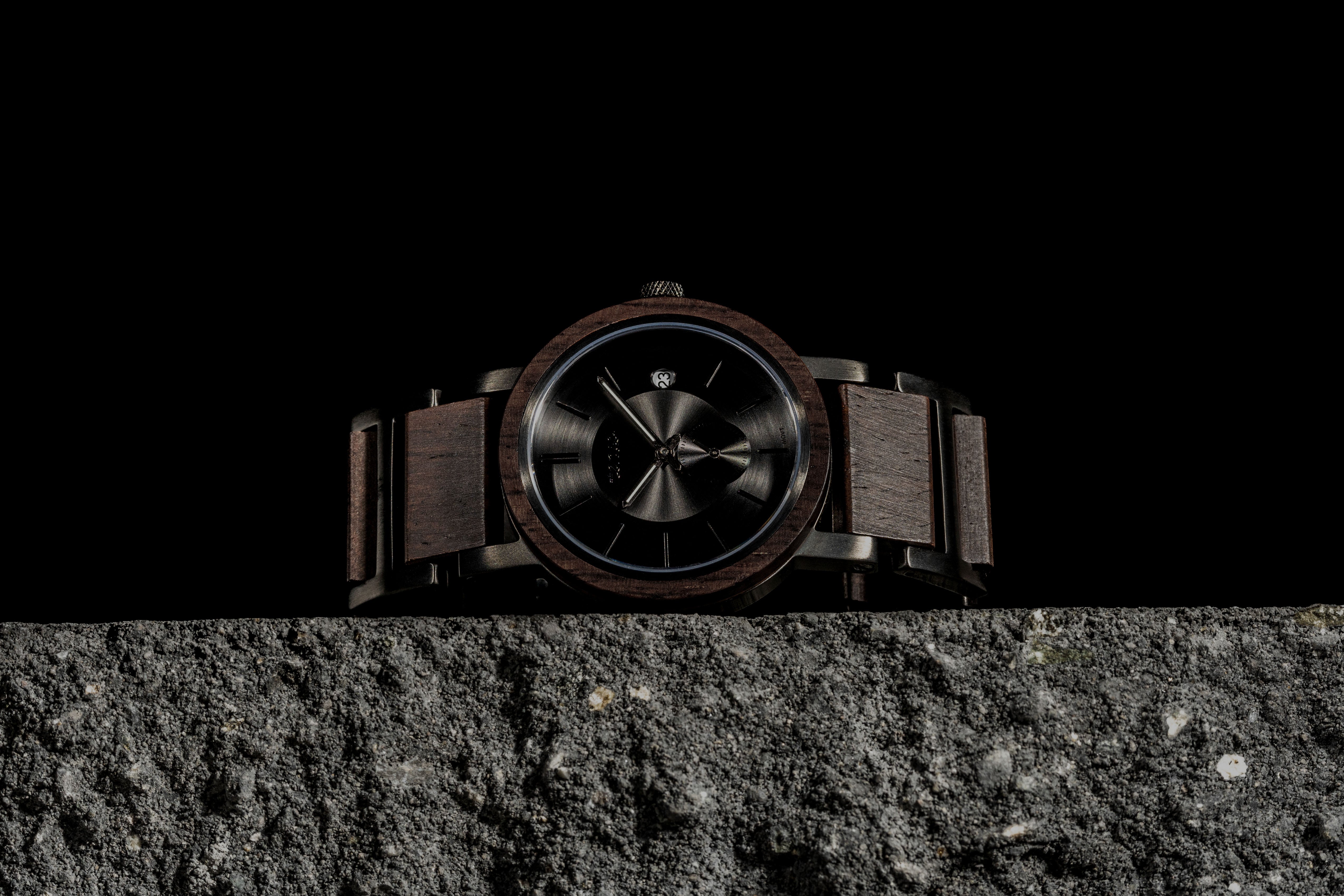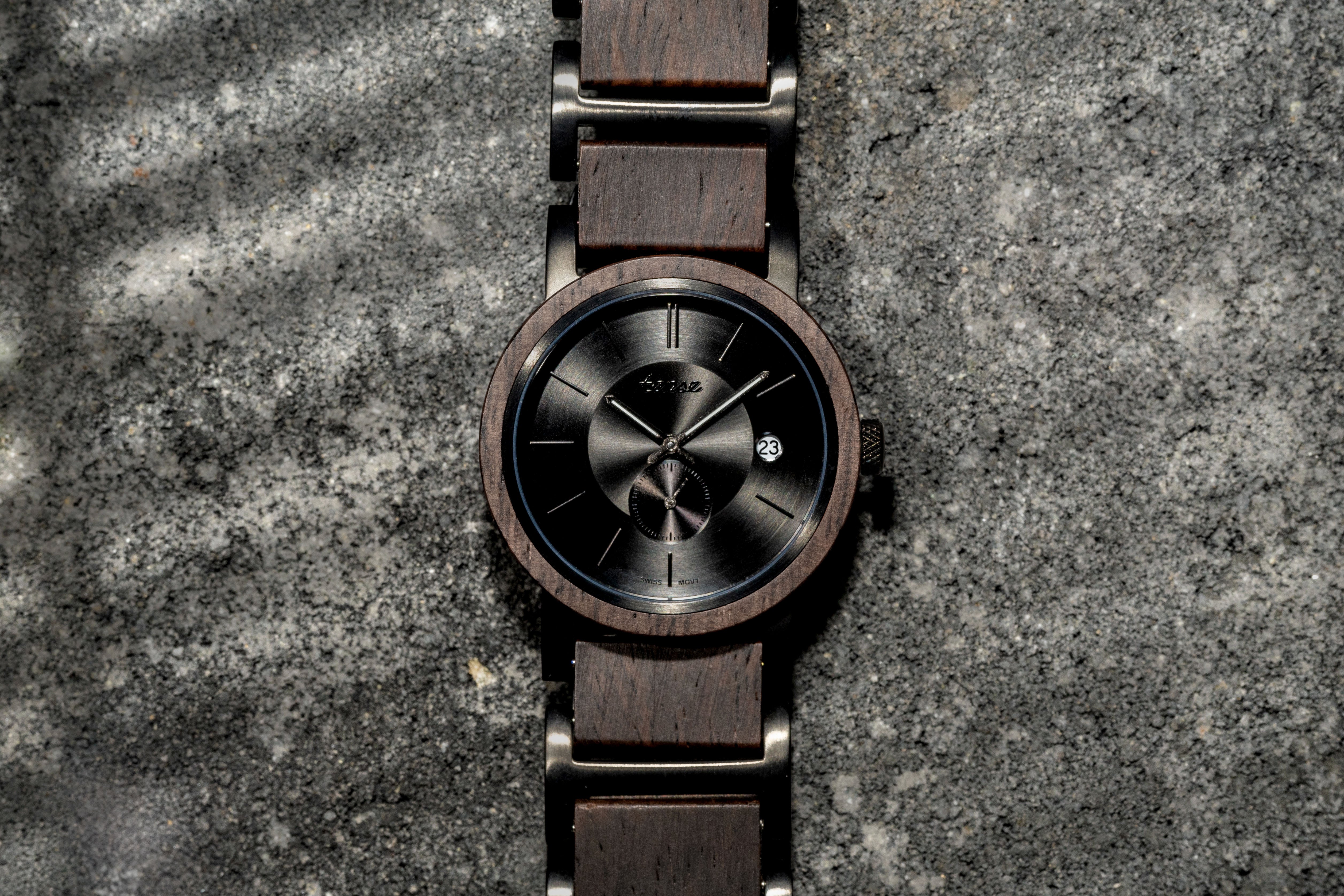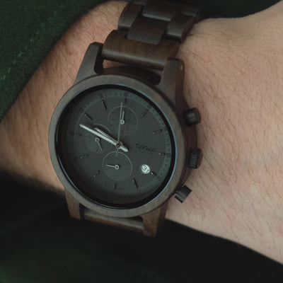 This unisex watch shows hour, minute, and second markers on a round dial. The Hampton is made from 100% recycled or reclaimed wood, with Miyota watch movement from Japan and is adjustable in size.
