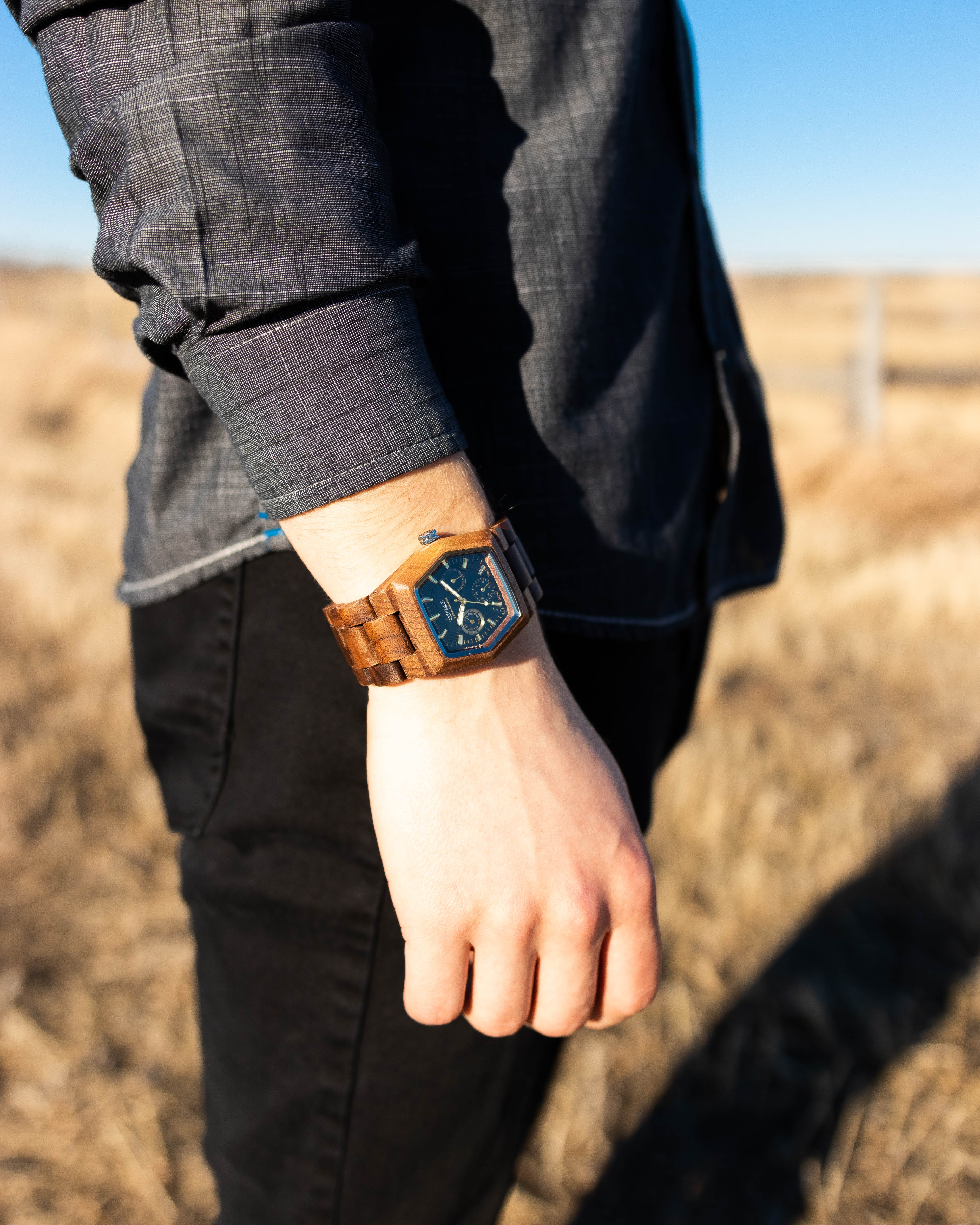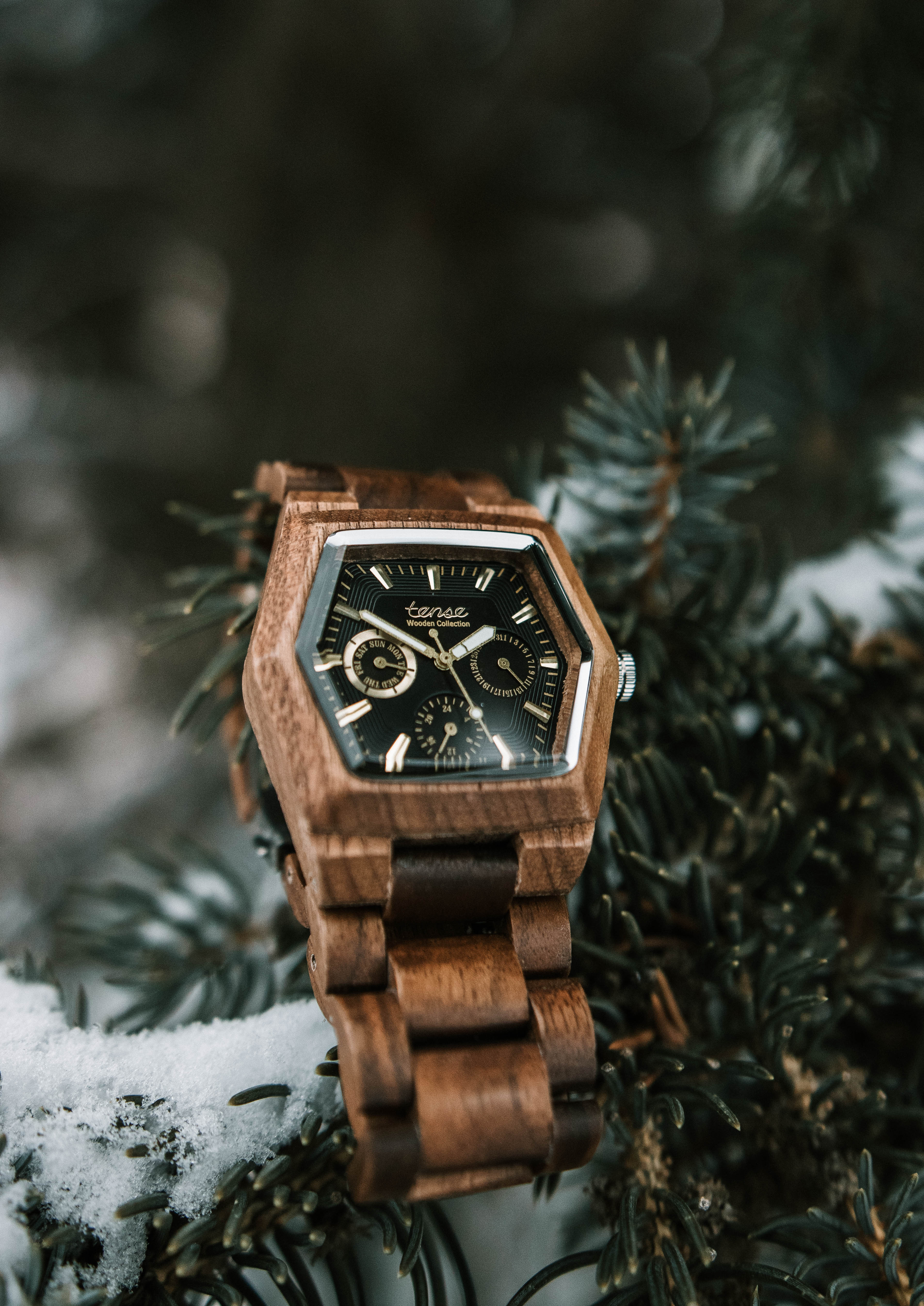 This unisex watch shows hourly markers, calendar date, days of the week, 24-hour display on a hexagonal face. The Marmot Multifunction Watch is made from 100% recycled and reclaimed wood, with Miyota watch movement from Japan and is adjustable in size with stainless steel crown and clasp.