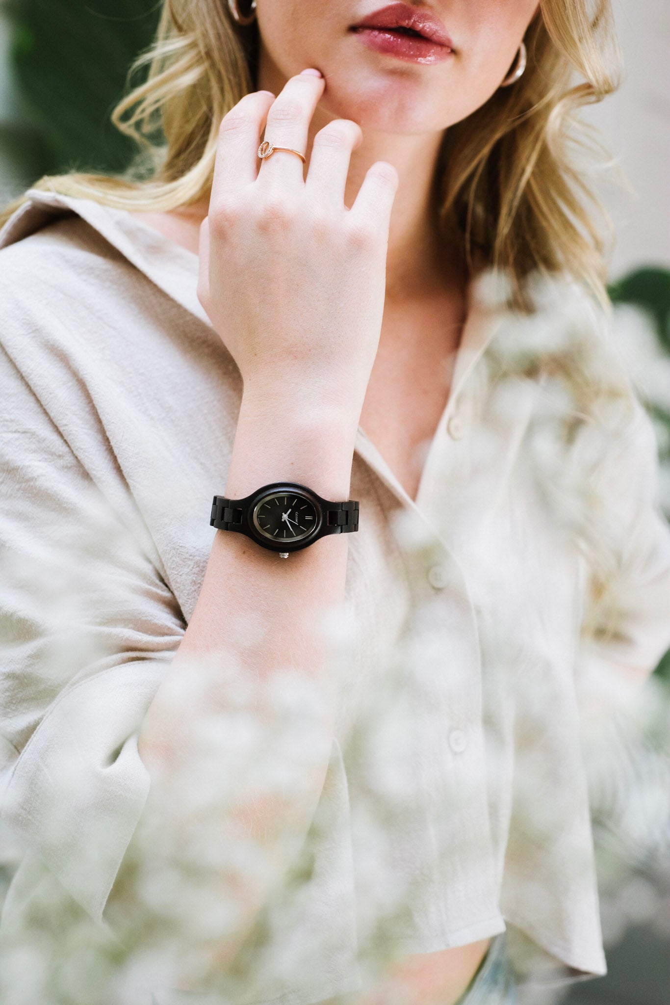 This women's watch shows hourly markers on a oval dial. The Mayne is apart of our Mini Collection. This watch is made from 100% recycled and reclaimed wood, with Miyota watch movement from Japan and is adjustable in size with stainless steel crown and clasp. All Tense Watches are Proudly Made In Canada.