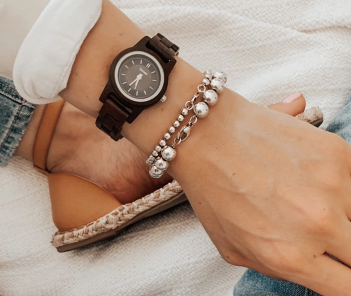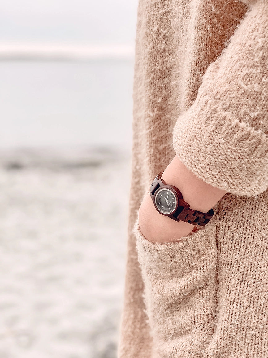 This women's watch shows hourly markers on a round dial. This watch features the classic Hampton look in a mini size. The Mini Hampton II is made from 100% recycled or reclaimed wood with Miyota watch movement from Japan and is adjustable in size.