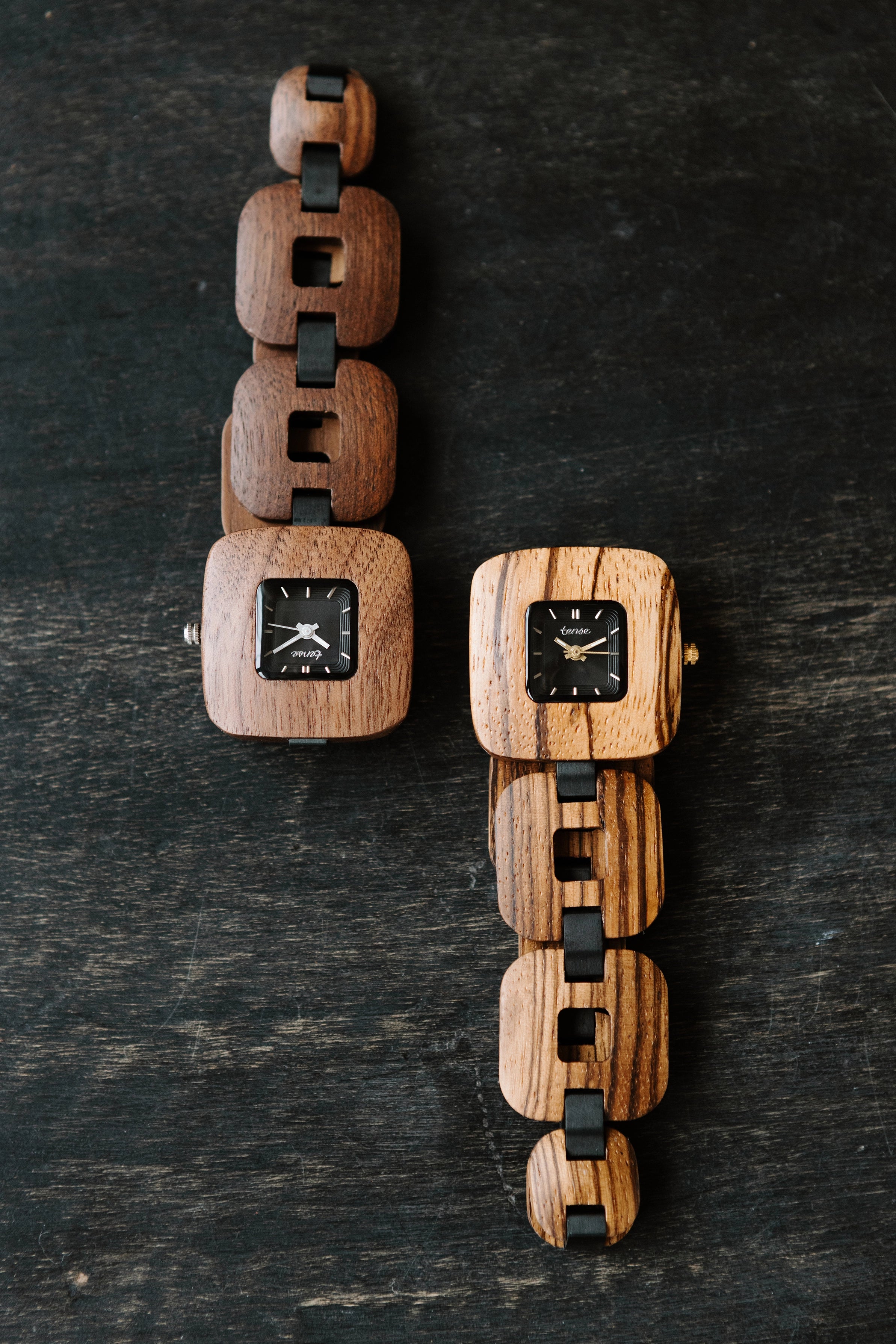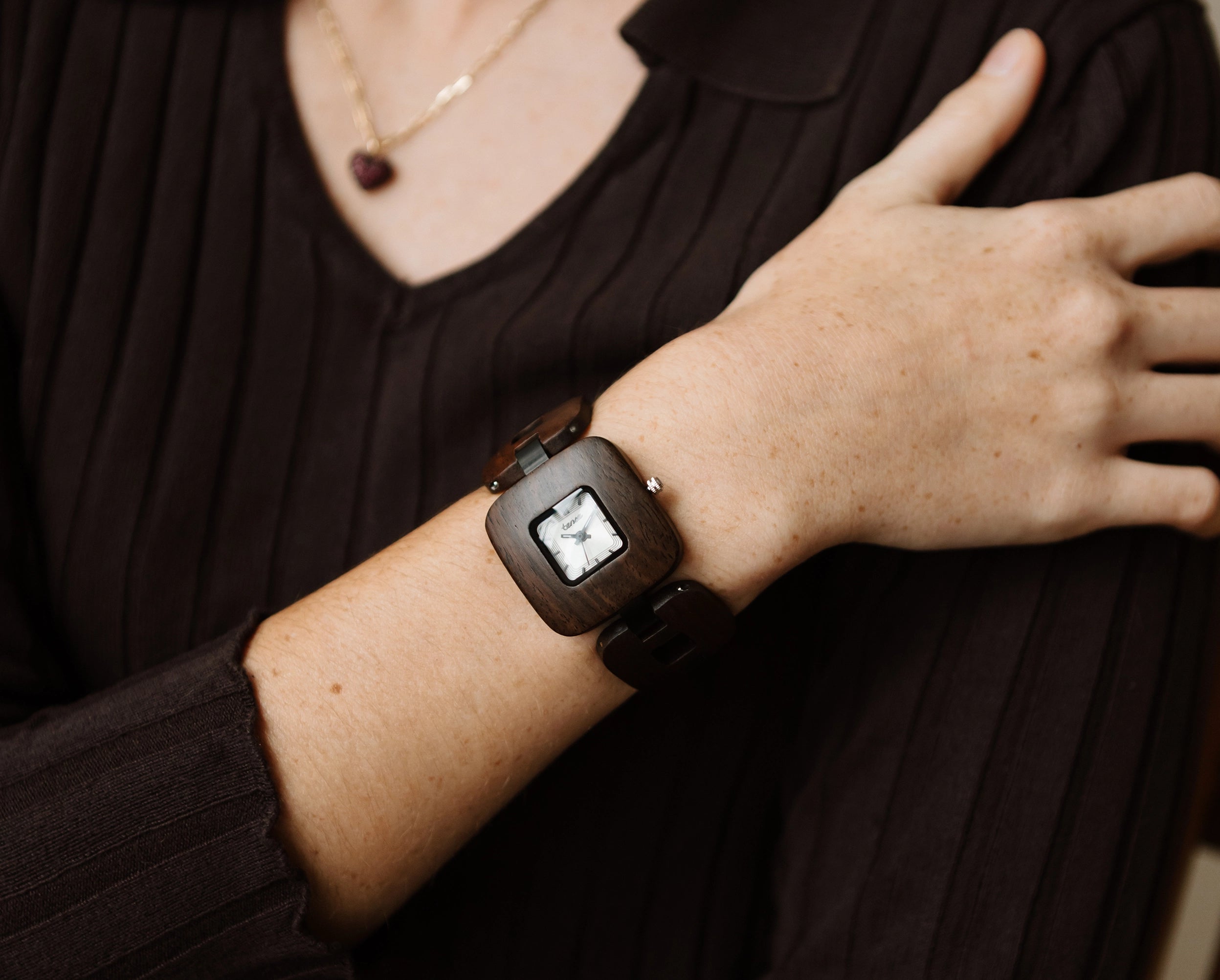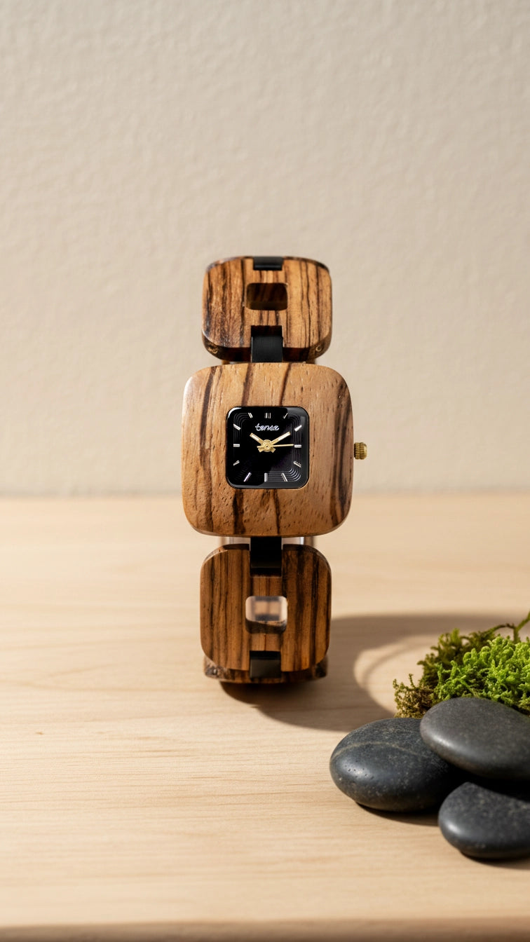 NEW ARRIVAL This women’s watch features hour markers on a square dial with a vintage-inspired design. The Nova showcases a compact wooden case and alternating wood and metal link construction for a bold, sculpted look. It is made from 100% recycled or reclaimed wood, combined with metal for added strength and style. Powered by a Japanese Miyota movement and adjustable for a comfortable fit.