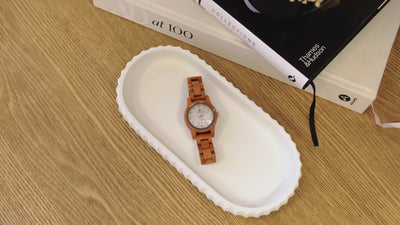 This women's watch shows hourly markers on a round dial. The Small Hampton is made from 100% recycled or reclaimed wood with Miyota watch movement from Japan and is adjustable in size.