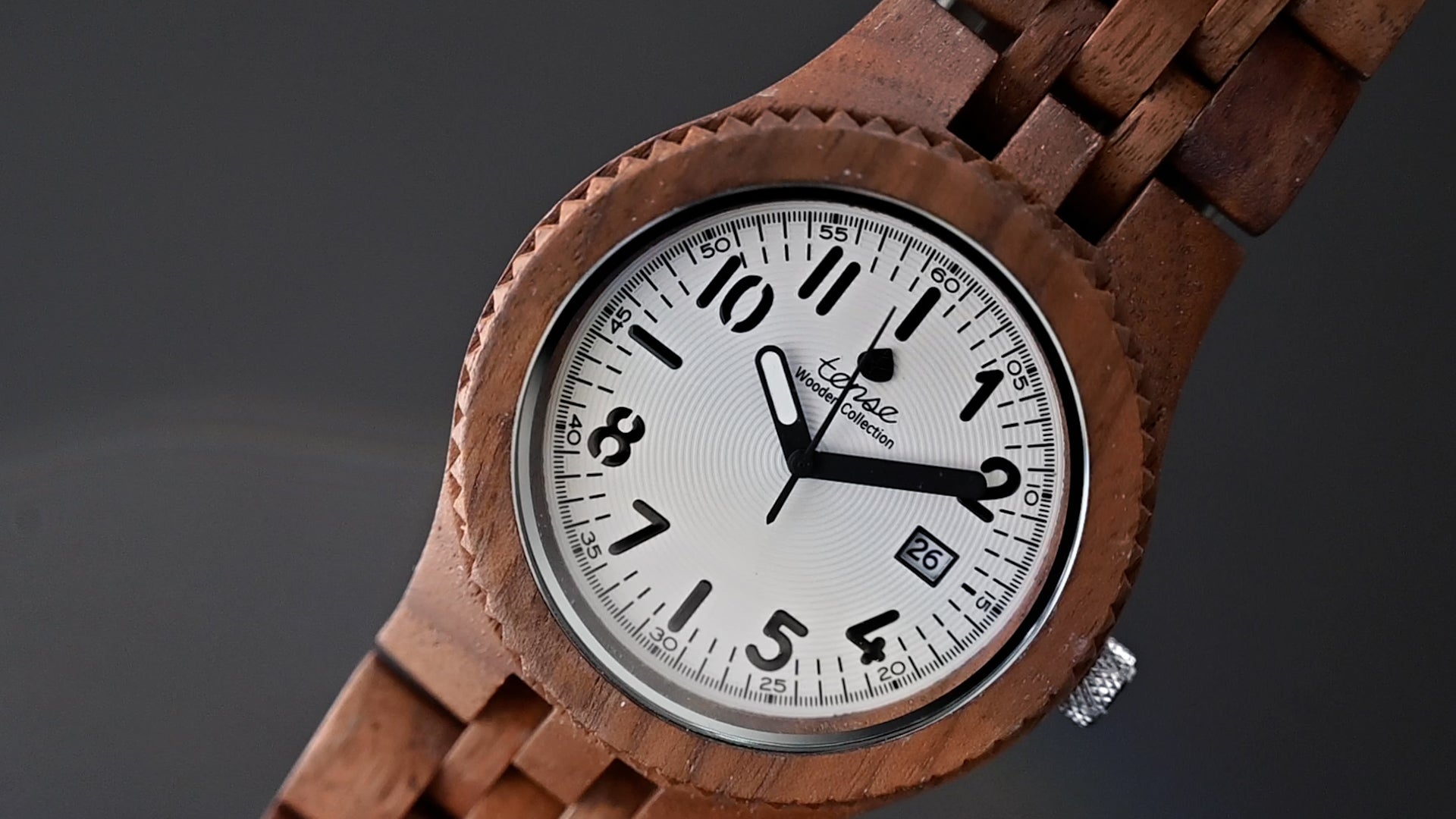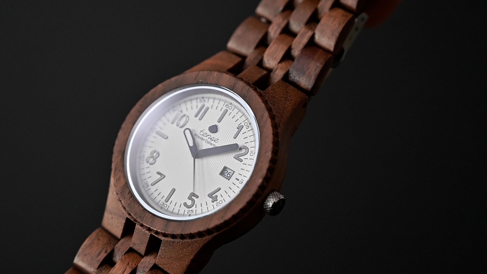 This men's watch shows hour, minute, second markers and the calendar date on an oversized round face. The Yukon is made from 100% recycled and reclaimed wood, with Miyota watch movement from Japan and is adjustable in size with stainless steel crown and clasp.